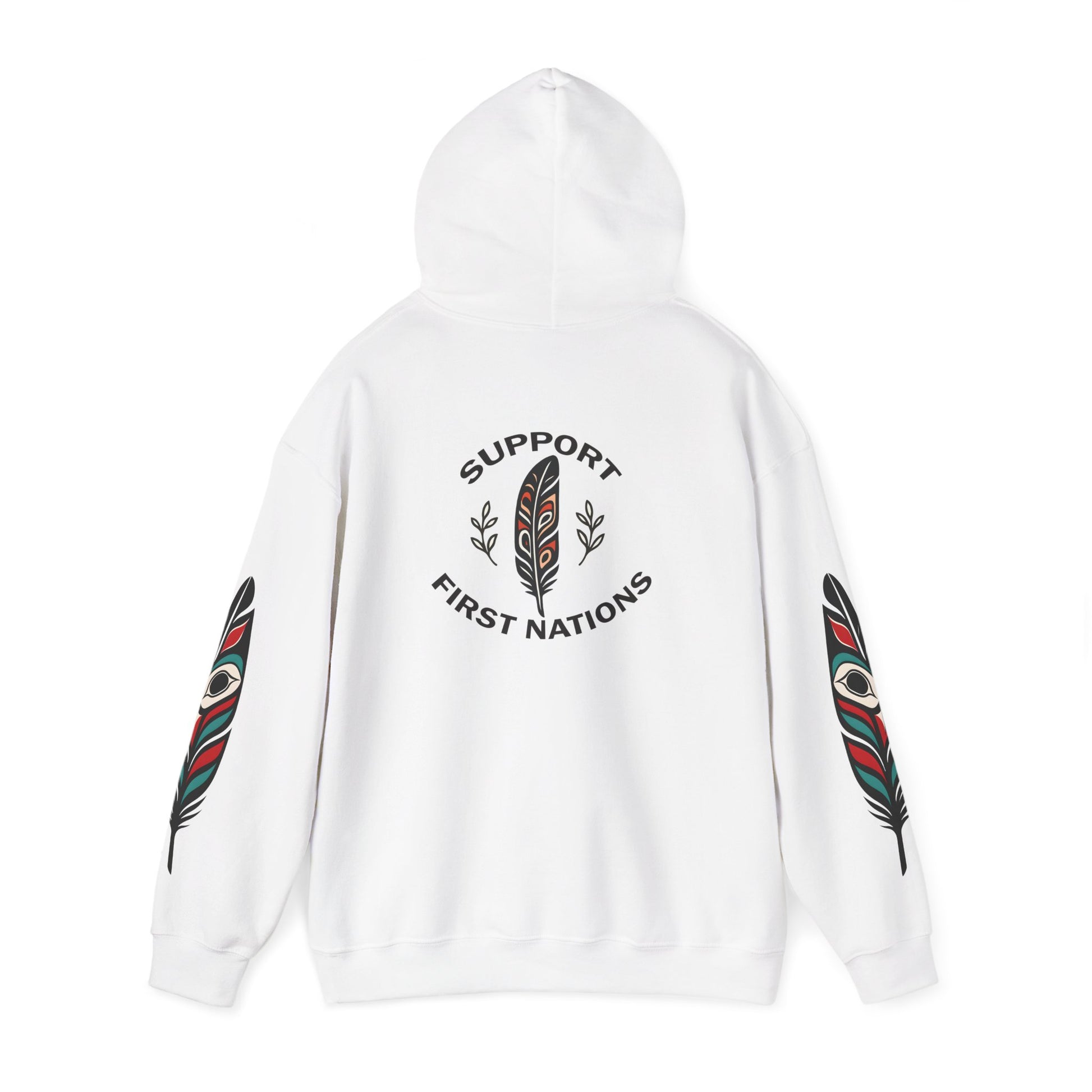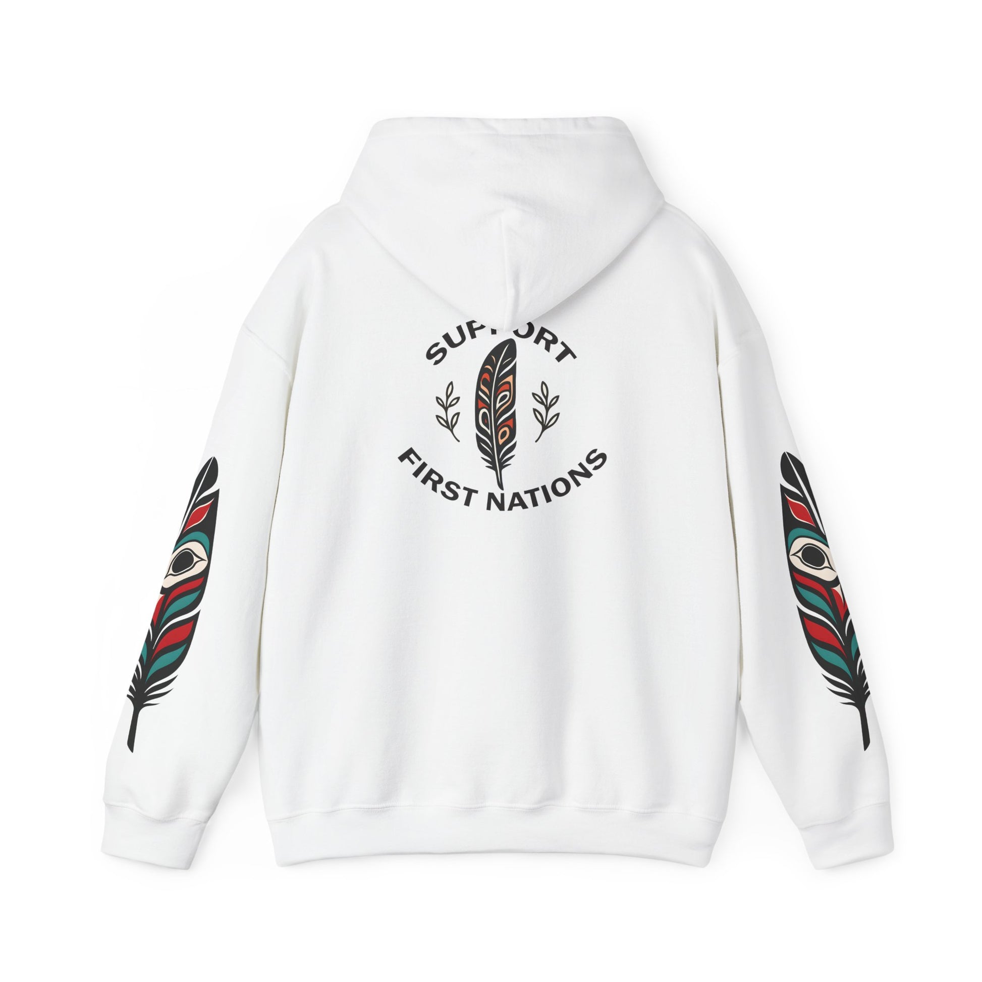 Designed for non-Indigenous allies who choose to stand with First Nations, this premium hoodie makes your support visible, grounded, and unapologetic. The bold Support First Nations design is centered around a stylized feather inspired by West Coast Indigenous art — a powerful symbol of culture, survival, and strength.
