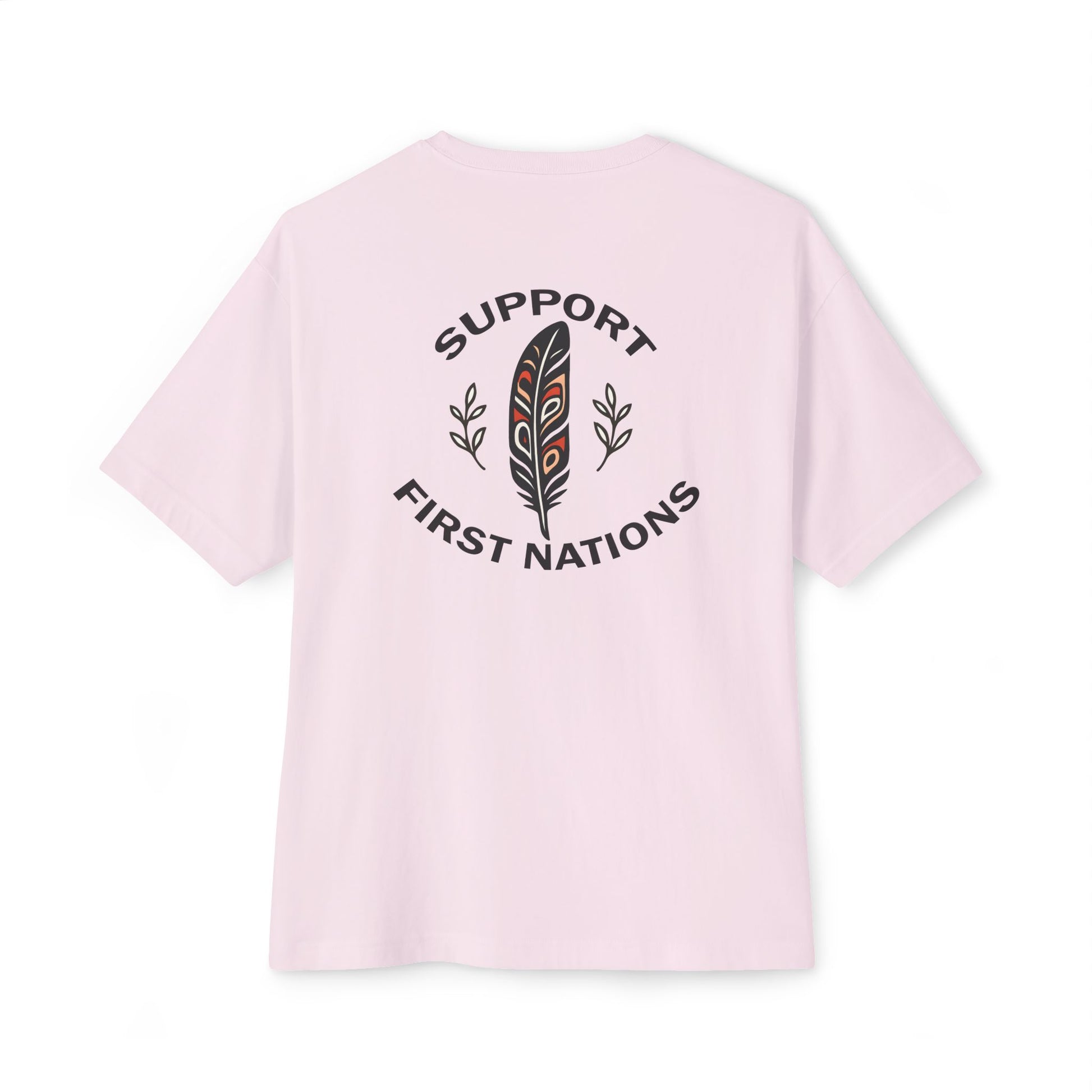 This oversized tee is designed for allies — non-Indigenous people who choose to stand in solidarity with First Nations communities. The bold design says what matters: Support First Nations, centered around a stylized feather inspired by West Coast Indigenous art.